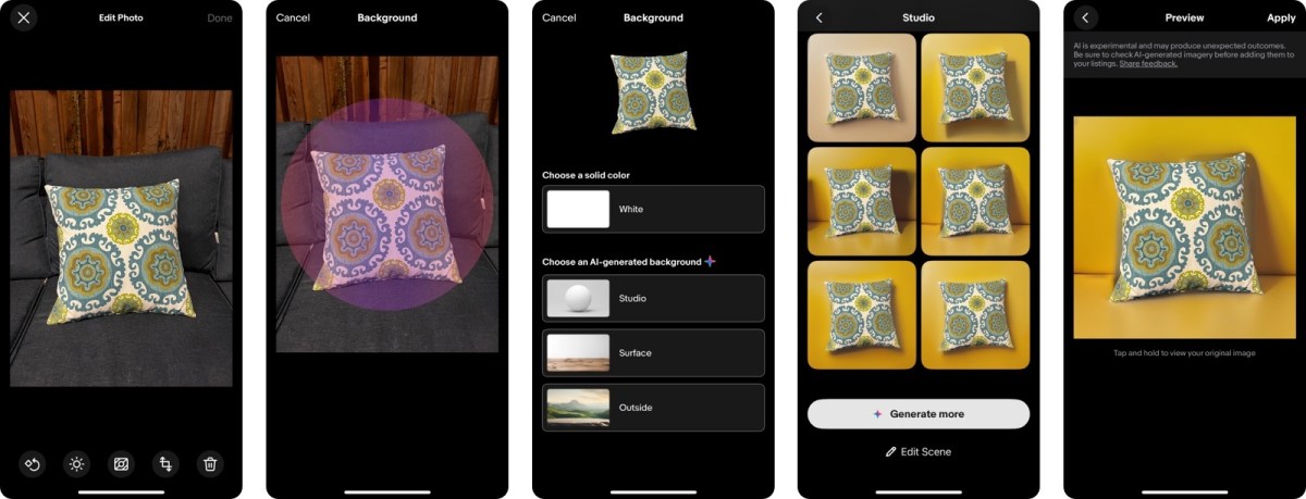 eBay کے پس منظر میں اضافہ کرنے والا ٹول ان بیچنے والوں کو فائدہ پہنچا سکتا ہے جن کے پاس پیشہ ورانہ نظر آنے والی یا اعلیٰ معیار کی تصاویر لینے کے لیے آلات یا مہارت کی کمی ہے۔ یہ ای بے کی پچھلی پیشکش پر بھی بہتر ہو سکتا ہے، جس نے فہرست کی تصاویر کو آسان بنانے کے لیے کمپیوٹر وژن ٹیکنالوجی کا استعمال کیا، سفید پس منظر. نئی AI خصوصیت اوپن سورس ماڈل Stable Diffusion کے ذریعے تقویت یافتہ ہے۔